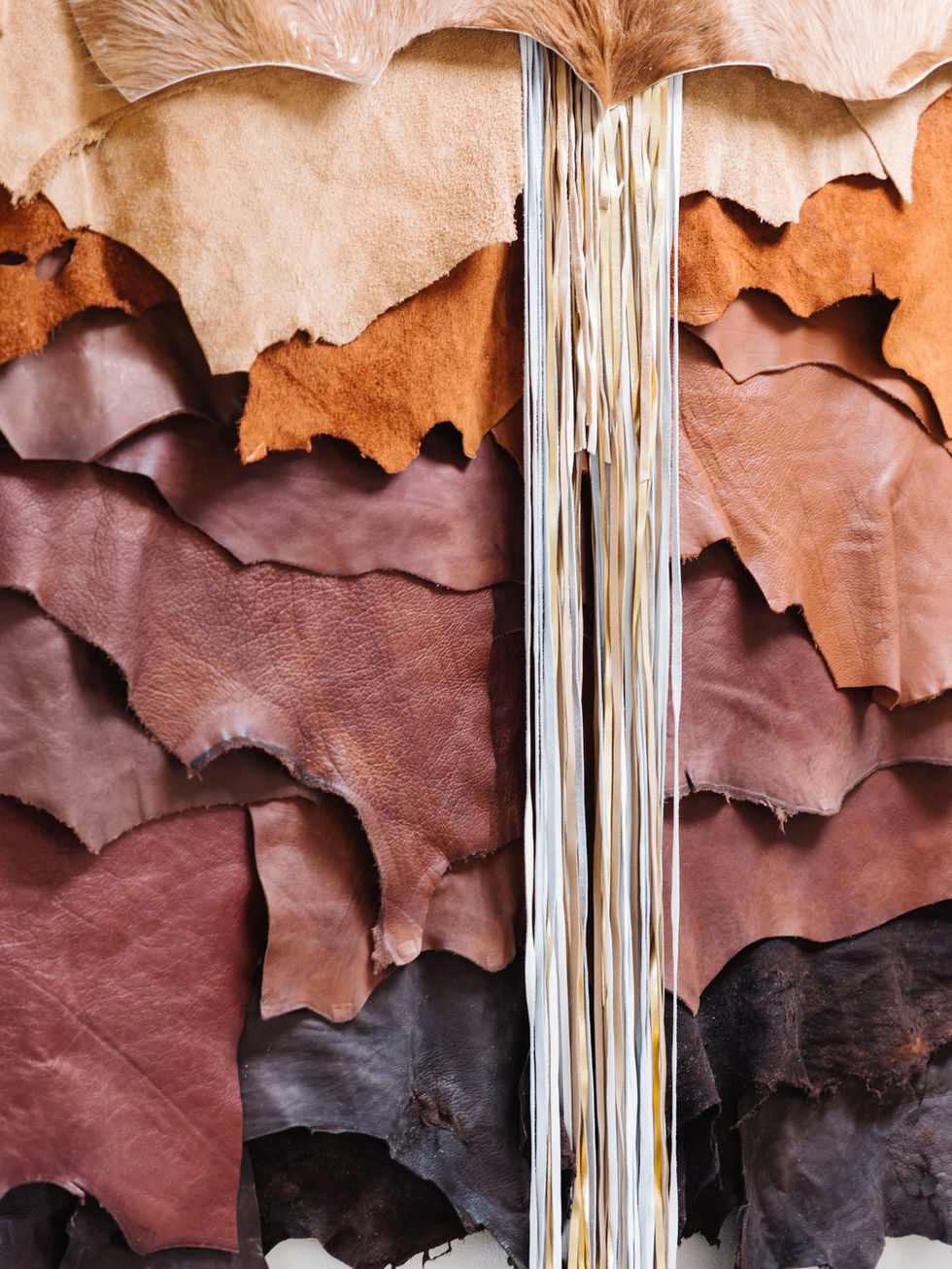 This stunning wall-hanging sculpture is a masterful blend of texture, movement, and organic elegance. Crafted from rich Italian leather in layered, cascading tones of deep brown, aubergine, and earthy taupe, the piece evokes the rugged beauty of western landscapes and natural topography. The raw edges and fluid drape of the leather create a sense of organic flow, while the circular metal accents anchor the composition with structural balance.